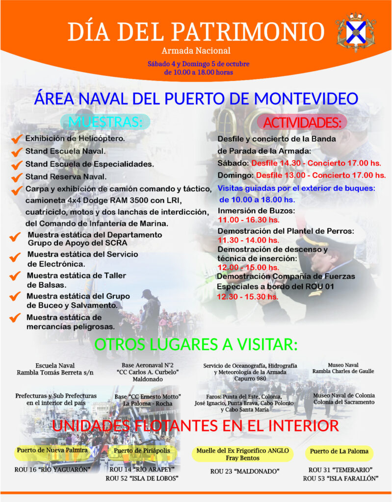 1 de octubre de 2025 - Noticias Actividades del Día del Patrimonio Calendario de actividades del Día del Patrimonio para el sábado 4 y domingo 5 de octubre de 10 a 18hs. Anterior Palabras del Señor Comandante en jefe, Almirante José Luis ELIZONDO CHIESA Siguiente Uruguay Profundiza el Debate Marítimo