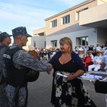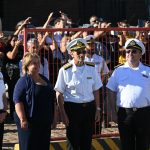 Comenzando con la ceremonia, la Señora Ministra de Defensa Nacional, acompañada por el Señor Encargado de Despacho de la Prefectura Nacional Naval, pasaron revista al personal de la Prefectura formado.